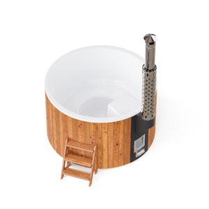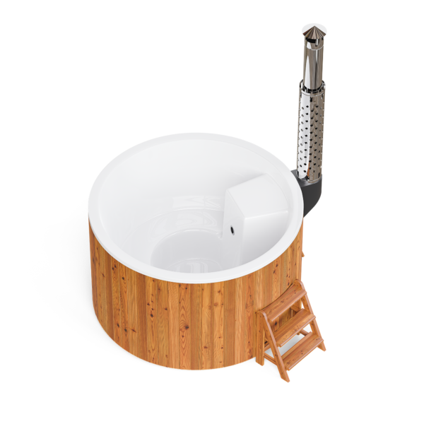 Модель полностью оправдывает свое название. Функциональность и дизайн изделия призваны сделать отдых премиальным. Чаша выполнена из высококлассного многослойного композита, а дополнительные защитные и декоративные свойства ей придает инновационное покрытие — гелькоут немецкой компании BUFA. Обшивку изготавливаем из экологичной термососны приятных оттенков. Выбирайте темный или светлый вариант, чтобы купель органично вписалась в дизайн окружающего пространства.